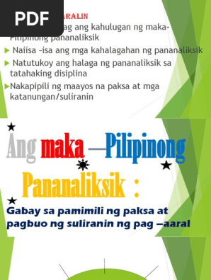 Ipaliwanag ang kahulugan ng maka-pilipinong pananaliksik. Ano-ano ang mga katangian ng maka-Pilipinong pananaliksik na dapat isaalang-alang sa pagpili ng paksa. Nakapagsusuri at naipaliliwanag ang ibat.